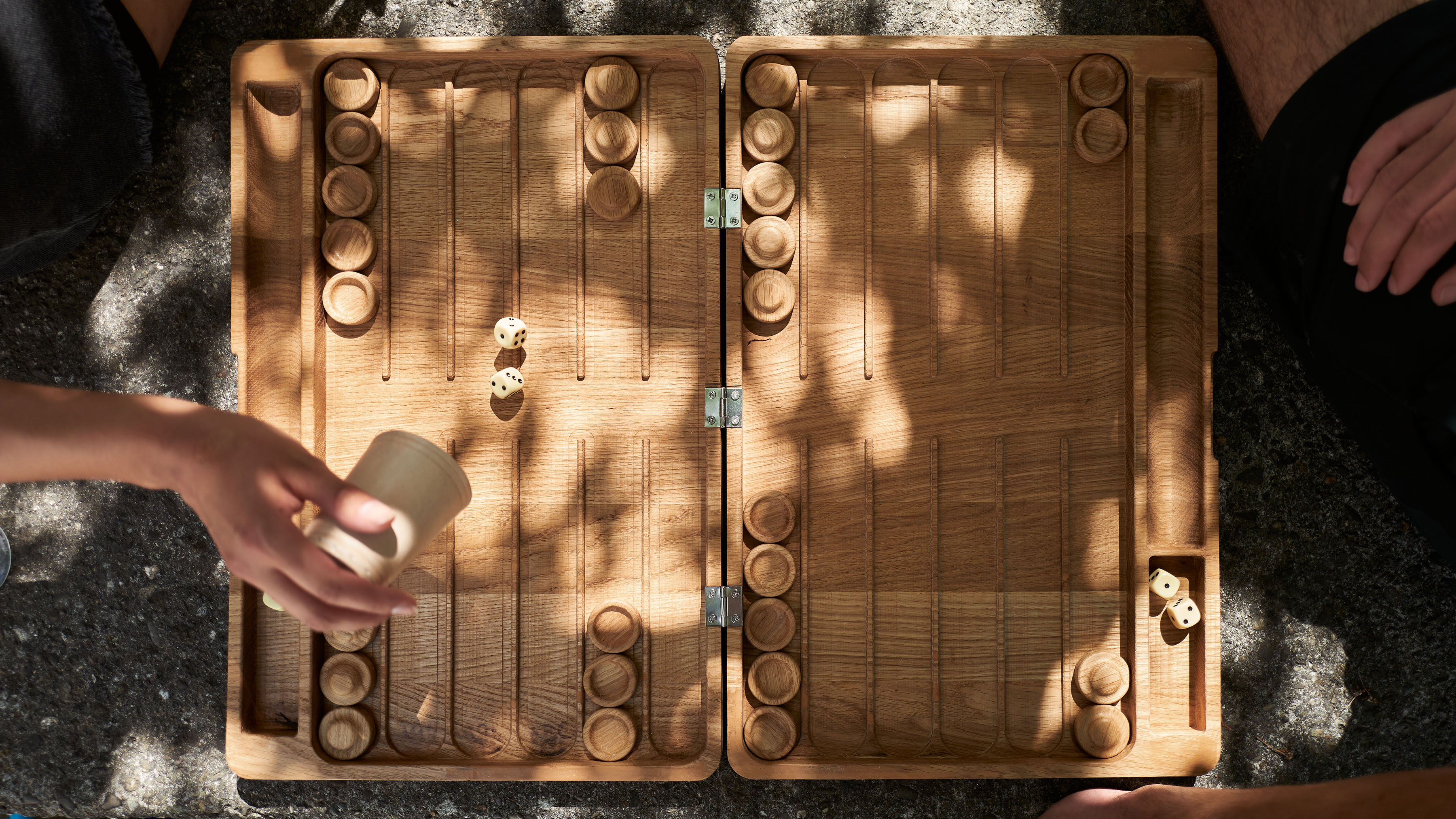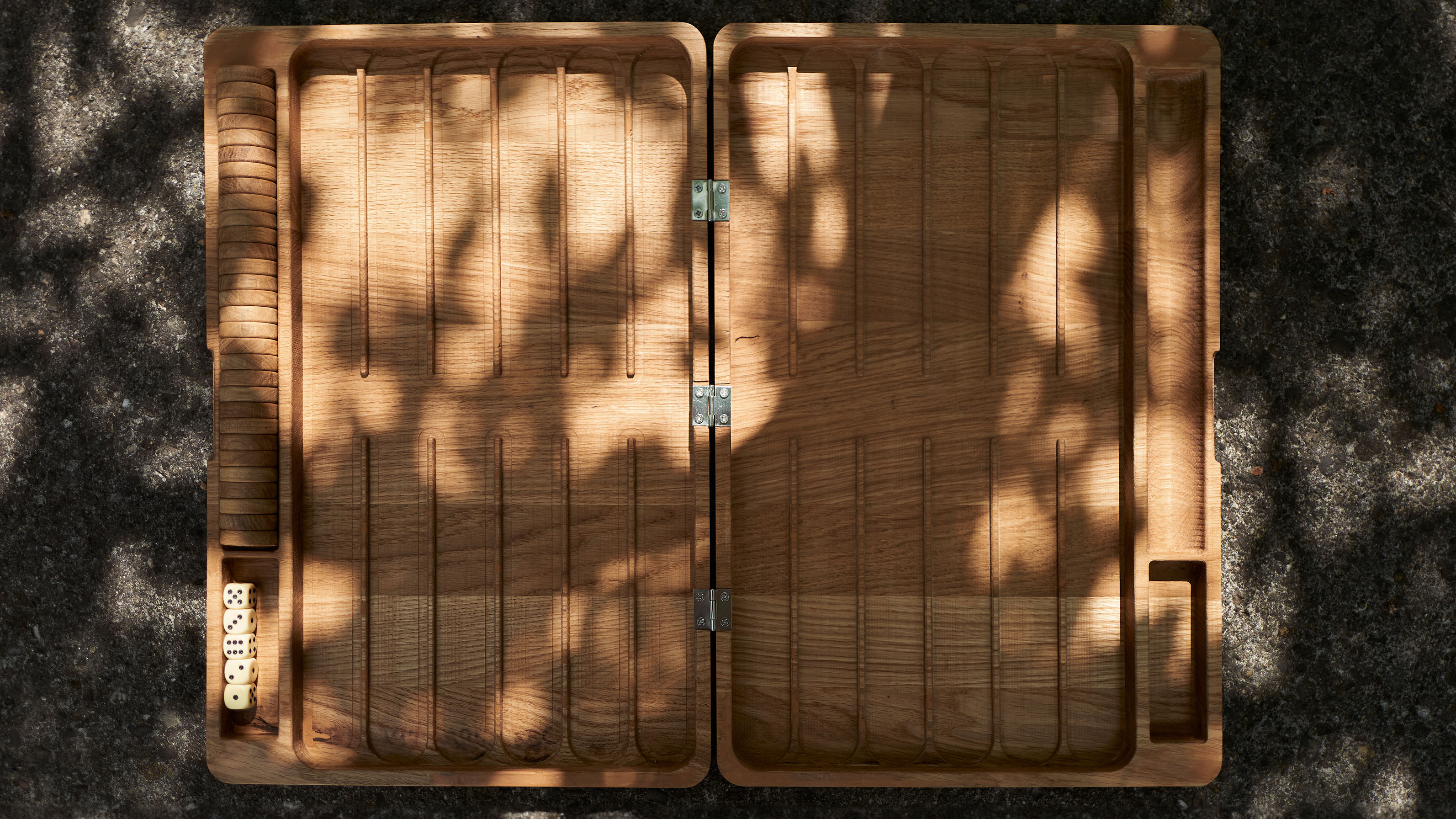 The Backgammon board is crafted primarily from wood, offering a warm, tactile feel with a refined, timeless aesthetic. To ensure that the game is fully playable by touch, we designed the two sets of pieces with distinct surfaces: